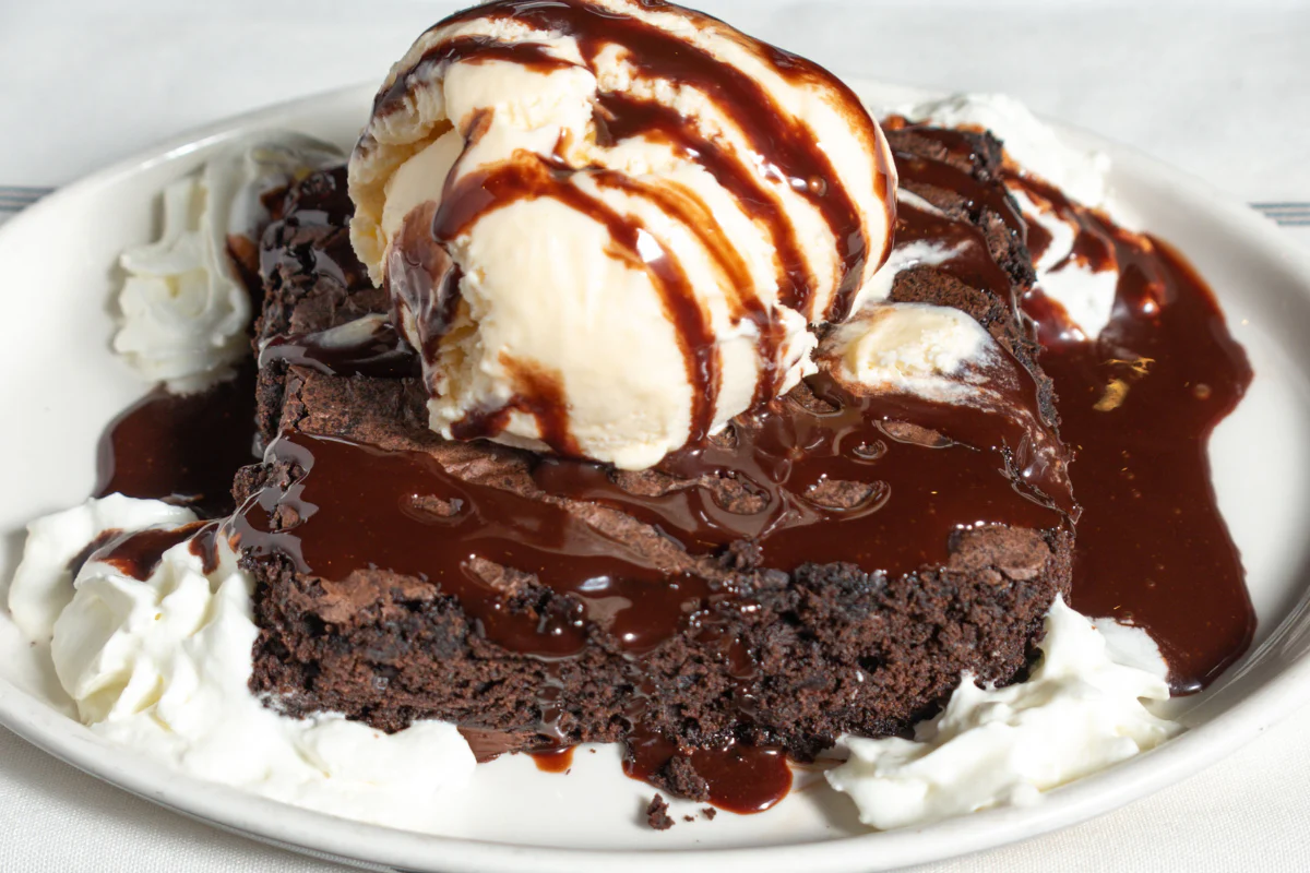 Freshly baked brownie with chunks of Ghiradelli® chocolate, drizzled with chocolate sauce and served with a scoop of vanilla ice cream and whipped cream.
