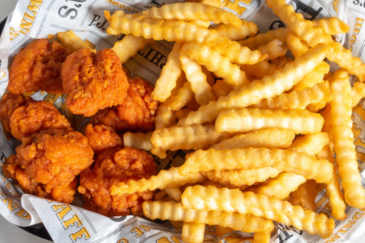 Wings without the bones - tossed in your choice of PJ's sauce, served with bleu cheese or ranch and fries.